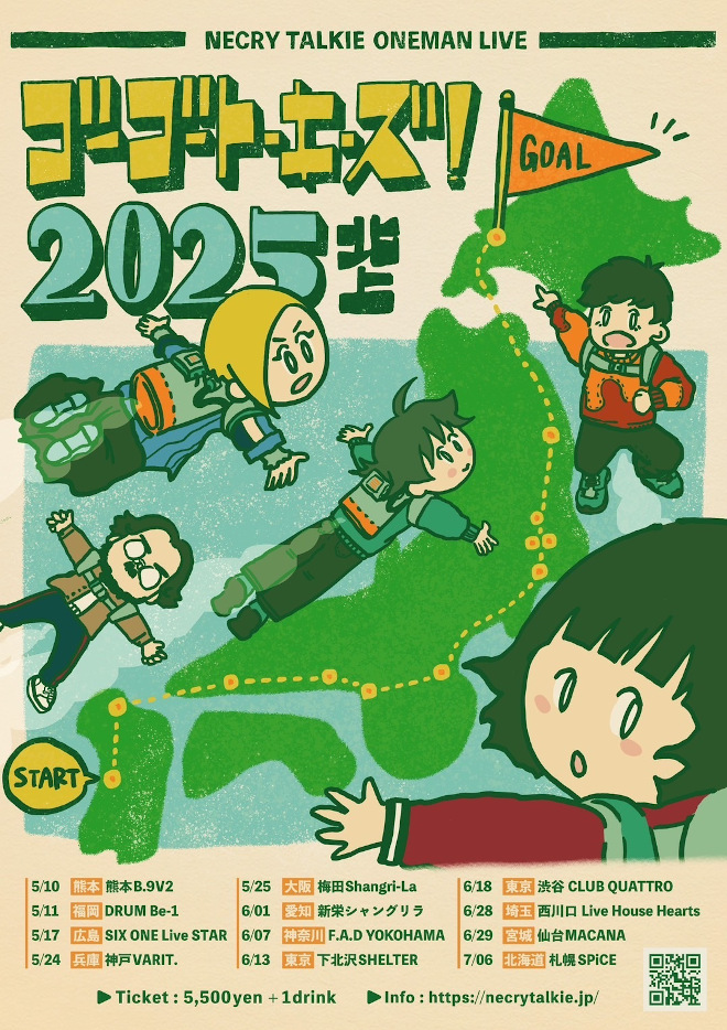 ネクライトーキーが新EPを引っ提げて開催するワンマンツアー<ゴーゴートーキーズ!2025 北上>は現在ローソンチケットにてプレリク先行を受付中。メジャーデビューアルバム『ZOO!!』に収録された人気曲「北上のススメ」に因んだワンマンツアーで、南は5月10日(土)の熊本・B.9V2から、北は7月6日(日)の北海道・札幌SPiCEまで、全国12会場を順に北へ向かう。