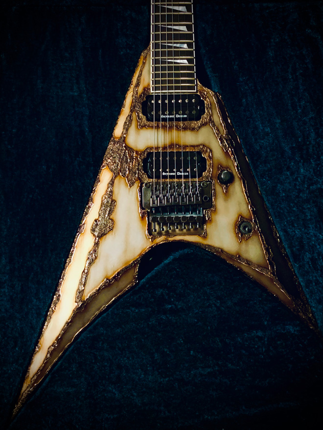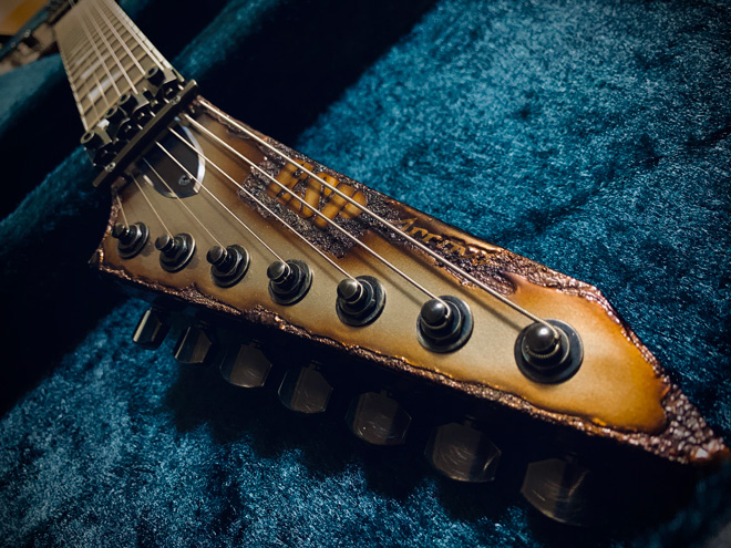 ESPが持てる技術の粋を結集して製作されるモデル、Exhibitionシリーズ。その2015年モデルの中の1本です。こちらはESPオリジナルモデルのArrowという変形ギターをベースに7弦化、そして全面にまるで何年も雨ざらしになったような風合いの錆びた鉄を思わせる塗装を施しています。しかし見た目からは想像も付かない手触りの滑らかさが特徴で、実際のプレイヤビリティも計算された作りの精巧さに脱帽です。