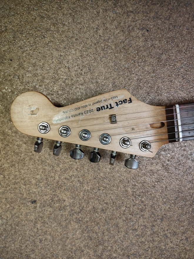 ロゴ剥がすのは悩んだが超見栄っ張りなぼくはどこかのオーダーギターみたく作った。ストリングガイドの位置が安物はおかしいと思う。みんな気にしないよね。