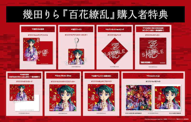 さらに、初回生産限定盤のBlu-rayには、自身初のツアーとなった2023年7月開催の<幾田りら 1st ワンマンツアー『SKETCH』>神奈川公演を収録。ゲスト出演した佐藤千亜妃との「線香花火」、東京スカパラダイスオーケストラ ホーンセクションとの「Free Free Free」のコラボパフォーマンスも収録されるなど、ファン必見のアイテムとなっている。店舗別特典では、完全生産限定盤のジャケットを飾る『薬屋のひとりごと』描き下ろしイラストをあしらったアイテムや、通常盤のジャケット写真となっているアーティスト蜷川実花による撮り下ろし写真、「百花繚乱」の楽曲ロゴを使用したアイテムなど、店舗によって絵柄が異なる。