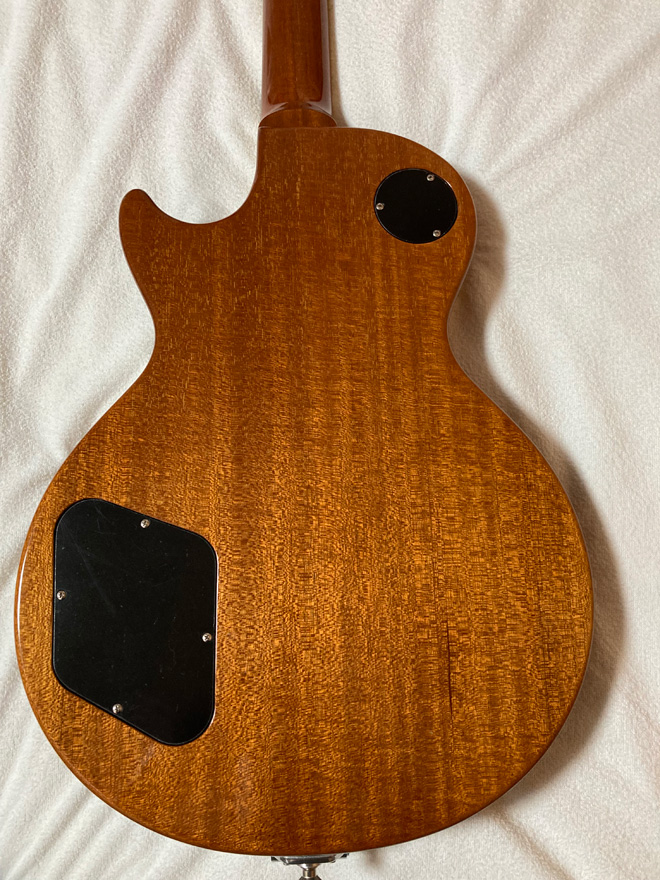 葛藤の挙げ句、一歩を踏み出すと加速が止まらず、あれよあれよと手が加わっていくというモデファイ天国は、沼にハマったギタリストのあるあるです。もったいないという周りの声など、小川のせせらぎにしか聞こえません。そしてこのゴールドトップ、めっちゃいい色じゃないですか。数十年後には緑青が浮いてきそうな貫禄があります。そして目を引くのはバックのマホの凄み。これワンピースかな。いい音するに決まっているじゃんという迫力があります。ゴリゴリにガンガン弾いてトップが剥がれてトラ目が顔を見せてくることには、名実ともに極上のビンテージになっていることでしょうね。楽しみしかない極上な1本です。(BARKS 烏丸哲也)