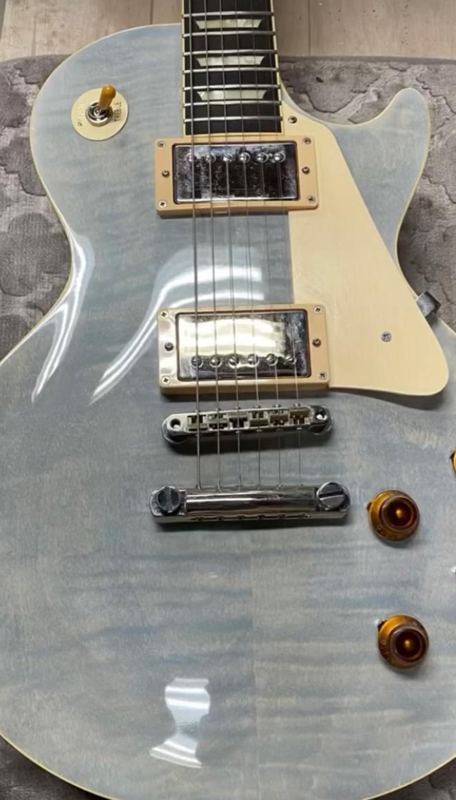新品の良いレスポールを探していたところ、これに遭遇しました。白なのかブルーなのかという色(カラー名はホワイトタイガーでした)にうっすらと出たトラ目、指板も赤みがかった綺麗なマダガスカルローズ。ほぼ一目惚れで買ったのですが、さすがトーカイのハイエンドモデルで音も弾きやすさも申し分無かったです。