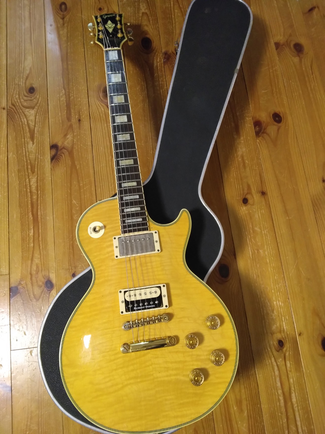 私が高校の時に大してギターも弾けないのに友達のお誘いがありライブに出ることに。当時はまともなギターも持っておらず、訳もわからないままでライブに臨もうとしていました。そんな中、義理の兄から「ライブに使うギター無いんやろ?このギターあげるわ!」と貰ったのがこのグレコの86年製のレスポールカスタムでした。確かその時は、BOSSのエフェクターのヘビーメタルも一緒に貰いました。