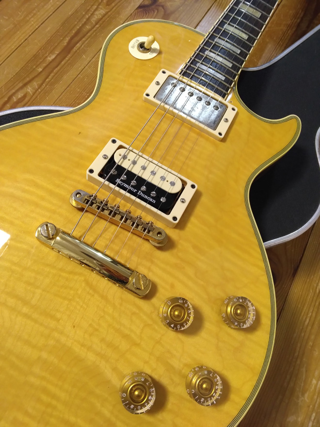 元々はボリューム、トーン、エスカッション、ピックガードは黒でした。ピックアップもフロントは57クラシック、リアはダンカンのディストーションに換えてます。色も元からですが、レスポールカスタムとしては珍しい、ナチュラルカラーのバリバリフレイムメイプルトップです。