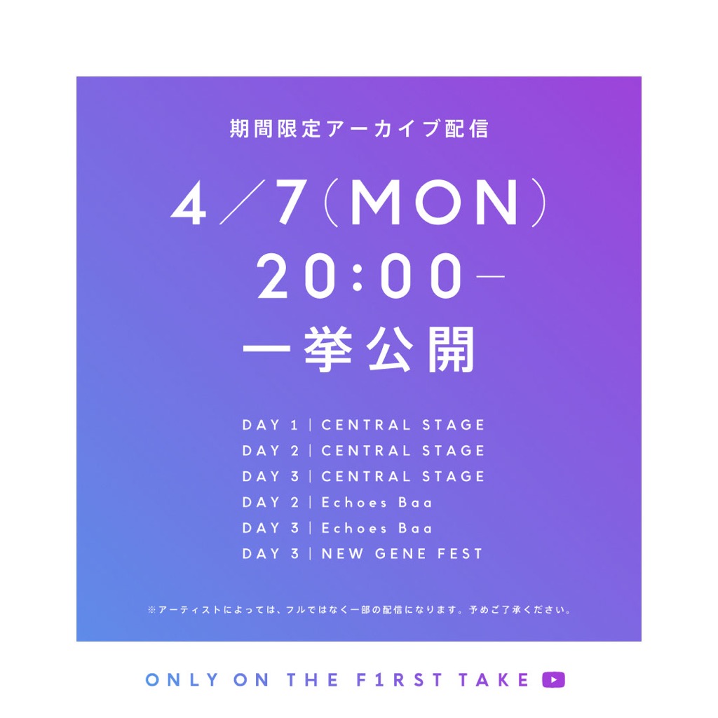 フィナーレを飾ったCreepy Nutsのライブ生配信終了後に、「THE FIRST TAKE」で期間限定のアーカイブ配信を行うことが発表され、4月7日(月)20:00より各ステージのパフォーマンスが一挙に公開となる。