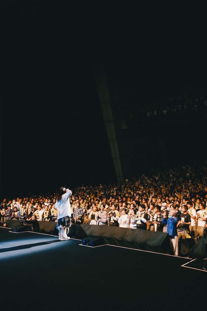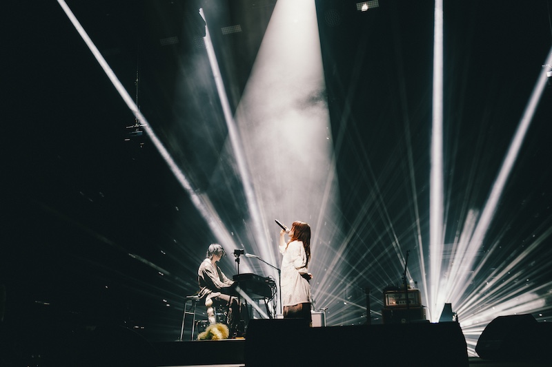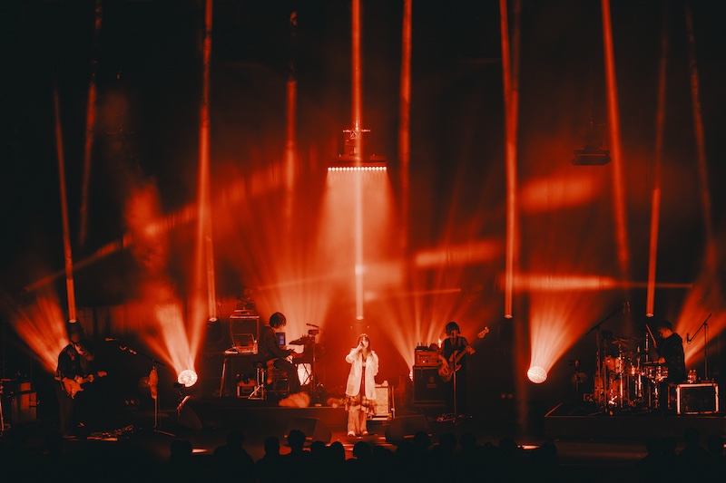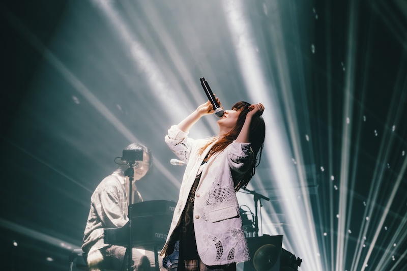 「1999」のラストでステージを覆ったスモークがゆっくりと晴れていくなか、にしなから「ずっとやってみたかった試み」としてアコースティックコーナーを行うことが告げられる。そうして演奏されたのは「FRIDAY KIDS CHINA TOWN」。ジャジーなイントロからゆったりとリズムが刻まれ、オリジナルバージョンとはまったく違う雰囲気を纏った楽曲が広がっていく。サウンドに身を委ねるように歌うにしなの姿が印象的だ。さらにキーボードの松本ジュンとふたりだけで「ランデブー」へ。ミラーボールが光るなかで届けられる歌はこの日の丁寧さを象徴するようで、オーディエンスはじっくりと聴き入っていた。静かにその余韻を味わう客席に「緊張感すごい!」と笑顔を向けるにしな。