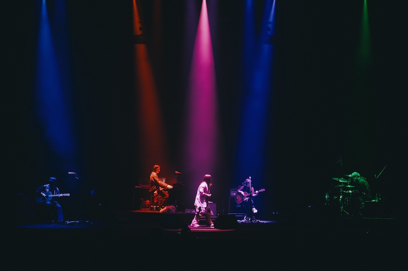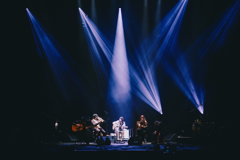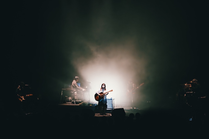 「次!」と一度ステージから去っていたメンバーを呼び込んで、今度は全員で「It’s a piece of cake」。真田徹のアコースティックギターに松本の鍵盤ハーモニカ、そしてTomiのベースに望月敬史が叩くカホン。みんなで円を描くように座って鳴らされるオーガニックな音像が心地よい。そこにオーディエンスによる「ラララ」のコーラスも加わって、ホール全体で音楽を生み出していくのだった。
