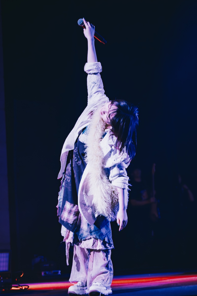 「みなさん、ごはん食べてきましたか?」。まるで家に友達を招き入れたような気楽さでにしなが話しかける。それぐらいの距離感で音楽を分かち合うことがこのライブのテーマであるということだろう。実際、この日のにしなの歌は、どの曲でもすごく丁寧で、一言一言に語りかけるような親密さが感じられた。みずみずしいメロディが弾けるくじらとのコラボ曲「あれが恋だったのかな」、一転してダンスビートとライトが煌めく「bugs」、そして赤と青の照明が美しくステージを照らし出すなかエモーショナルに歌い上げた「夜になって」――曲ごとに表情を変えていくその歌とサウンドが、オーディエンスのさまざまな感情を呼び起こしていく。そんななか、いっそう繊細に届けられたのが「1999」だった。バンドが奏でるおおらかな音にのって、大切な人に話しかけるように風景を紡いでいくこの曲が、ライブ前半のハイライトだった。