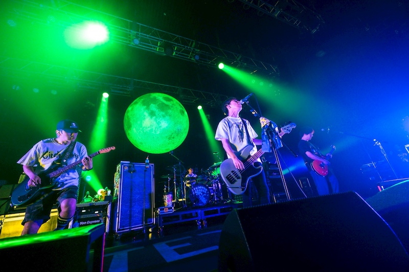 けたたましく鳴りまくるKOUHEI(Dr)のドラムで「Jumper」が始まるとやはり脳裏に浮かぶのはこの数年のこと。フォーリミが、僕らが進んでいるのは、決断の連続の先に新しい歩幅で歩いてきた道。RYU-TAの濁声が突き刺さる「knife」、HIROKAZのリフが冴えわたる「fiction」「夕凪」と畳みかける中、フォーリミと歩んできた日々が頭を巡る。ライブ中、ステージの満月は勿論だけれど、ずっと気になっていた8個の丸いライト。GEN曰く「水金地火木土天海」ということで、そうか太陽系の惑星までステージから僕らを照らしていたのか。じゃあ僕たちが冥王星としてフォーリミを照らしてやろう。「今夜は月が綺麗ですね」とさりげなくGENが言っていたけど、それって僕らを口説いてる? MC中は相変わらず名古屋のCMソングを歌いまくっているけれど、それって照れ隠し?「in out」「Any」「happiness」と続く中、そういえば「happiness」が名古屋の企業「メニコン」のタイアップソングだったことを思い出す。「白樺リゾート池の平ホテル」の皆さ~ん!「青柳ういろう」の皆さ~ん!フォーリミがライブで毎回CMソングを歌っていますよー! どうか、広報の方に、届け。