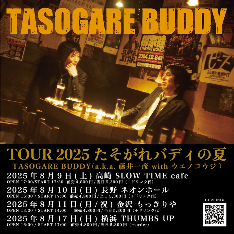 <TOUR 2025 たそがれバディの夏>と名付けられたツアーは、8月9日に高崎 SLOW TIME cafe、8月10日に長野 ネオンホール、8月11日に金沢 もっきりや、8月17日に横浜 THUMBS UPで開催される。