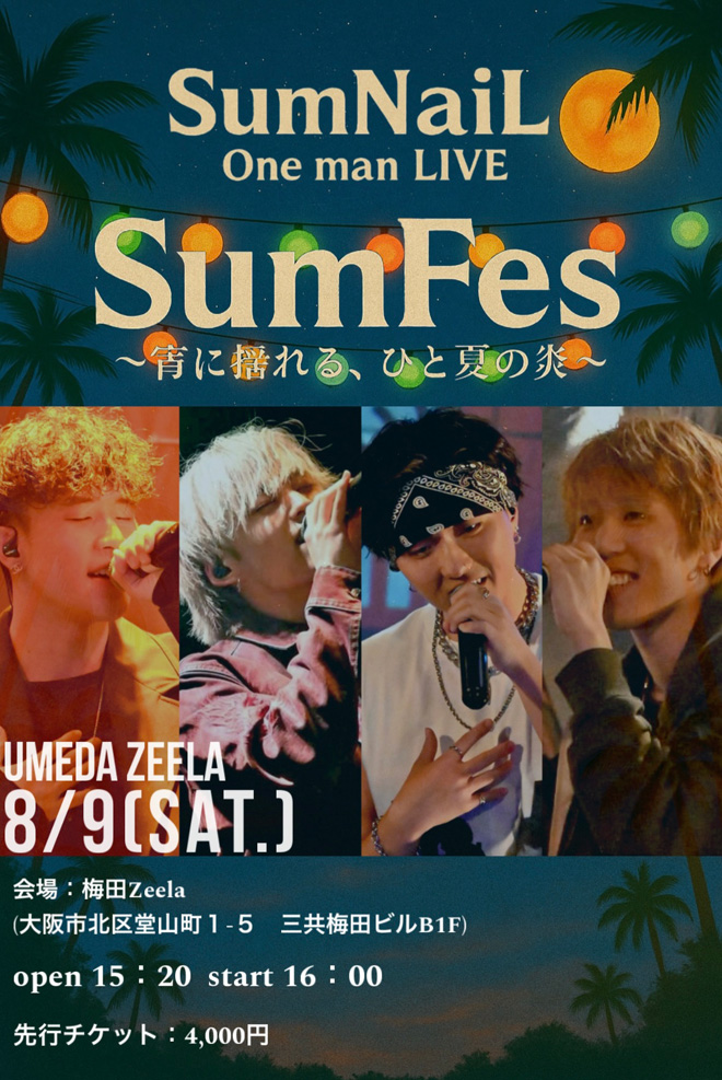 8月9日には梅田Zeela(ジーラ)にて<SumNaiL One man LIVE「SumFes」>が開催となる。