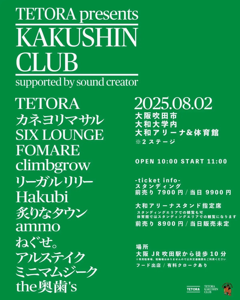 TETORAは2024年8月12日に日本武道館ワンマンをソールドアウトしており、2025年8月には自身初の主催フェス<KAKUSHIN CLUB>開催も決定している。