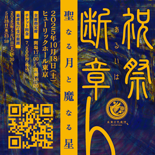 新たな公演のタイトルは、未来古代楽団 祝祭あるいは断章4『聖なる月と魔なる星』で、ヒューリックホール東京にて、2025年10月18日(土)に開催となる。