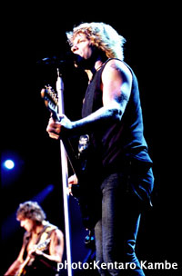 あえて普段どおり活動している姿を見せることで、アメリカ国民が立ち直っていることを証明したい。それに、音楽でしか僕達は人々を勇気づけることしかできないからね」。こうしたポジティヴな精神を胸に抱き、ボン・ジョヴィはこの日、あえてステージに立ったのだ。じゃあ、なんでアメリカでライヴをやらないの? と言われるとさすがに僕も良い答が出せないのだが、おそらくは、この日にライヴを行なうことに反感を示す一部のアメリカ国民の感情に配慮してということと、全世界ブレイクのキッカケを作ってくれた愛すべき日本から、まずは世界に向けてのメッセージを、といった意図によって今回の事の運びとなったのだろう。