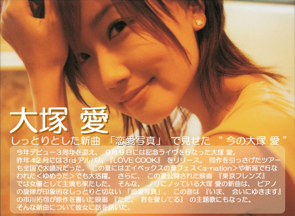 「恋愛写真」【CD+DVD】 avex trax 2006年10月18日発売 \1,890(tax in) ■大塚 愛 オフィシャル・サイト http://www.avexnet.or.jp/ai/ ■映画「ただ、君を愛し てる」 × 大塚 愛「恋愛写真」 SPECIAL WEB SITE 『HEAVENLY FOREST』 http://www.tadakimi.com/