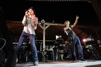 (土)、日も暮れ掛かった19:00より、海の家の中に作られた特設ステージにケミストリーがバックバンドを従えて登場! 告知を聞きつけ集まったファンはもちろんのこと、たまたまその場に居合わせたラッキーな海水浴客などで海の家の前には2,000人を超える人たちが集まった。