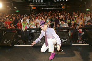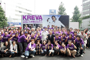 そこからは渋谷に移動し、いきなり店頭挨拶まわりをスタート。アルバムのアートワークが配された宣伝トラックから、真っ白いスーツとイメージカラーの紫をポイントにした衣装に身を包んだKREVAが登場。紫のTシャツで統一された「よろしくお願いします隊」と合流し、まずは選挙活動さながらにメガホンで「よろしくお願いします」をPR。スクランブル交差点のTSUTAYAから、なんと徒歩でセンター街を移動しHMVへ。もちろんこの間「KREVAだ!」「KREVAじゃん!」「キャー!」「ウォー!」攻めだったのは言うまでもなく。もちろんスタッフは、絶好の「よろしくお願いします」モード。…カチャ、カチャ、カチャ。