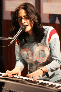 9月19日に2ndアルバム『TODAY』をリリースしたアンジェラ・アキが、その前日の18日、東京タワーで<メガネっ娘ライブ・Again>と題したスペシャル・ライヴを行なった。