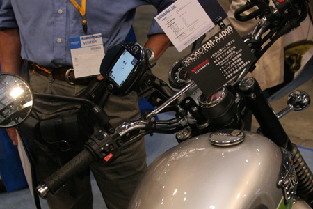 カーナビならぬ、バイクナビは、CARPOINT/R.W.Cのブースにて。このXROAD「RM-A4000」は、バイク専用のポータブルナビ。防滴仕様で雨に濡れても大丈夫。さらに、Bluetoothを内蔵&レシーバー付属で、音声案内も聞き逃すことはなく、さらに曲がる方向などは本体に搭載されているライトでお知らせしてくれる。でも担当者はバイクの免許がない。