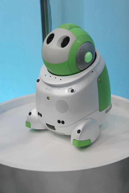 こちらはNECのパーソナルロボット「PaPeRo」。音声認識技術を使って、言葉のやりとりができたり、画像認識技術で人の顔を識別できたり、撫でられたり叩かれたりがわかったり、携帯電話(FOMA)を内蔵しているので、自分が屋外にいる場合でもこのロボットの目を通じて室内の様子などを見たり、またロボットを介して誰かと通話することもできる。あとは四次元ポケットさえあれば、あのネコ型ロボットになる!? ちなみに参考出展。