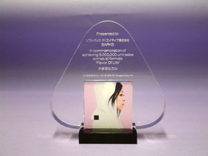 ちなみに右写真は、「Flavor Of Life」の800万ユニット・セールス記念のトロフィーで、メディア各社に名入りで贈られたもの。