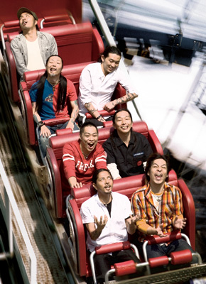 まずは右の写真を見て欲しい。どこぞのファンキー集団かと思いきや、なんといまや日本を代表するミクスチャーロックバンド、Dragon Ashなのだ。勘のいい人ならすでにお気づきかと思うが、どうやらこの写真は東京・浅草花やしきで撮影された模様。銭湯や民家に向かって突進する日本現存最古のコースターに、普段はクールなKjも思わず白目をむいてしまった瞬間が激写されている。