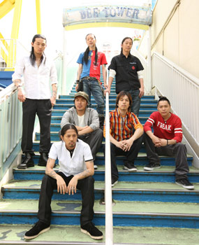 ちなみに、前列向かって左の白目むいてるのがKj(Vo)、その横が桜井誠(Dr)、2列目左からDRI-V(ダンサー)、Hiroki(Gt)、3列目左からIKÜZÖNE(Ba)、ATSUSHI(ダンサー)、一番後ろで魂抜けてるのがBOTS(Turntable)だ。欲を言えば、Hiroki、DRI-V、ATSUSHIの3名がもっと変顔になっていたら、さらによかった!? なんて。
