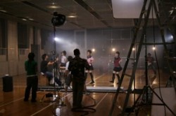 撮影は順調に進行しているらしい。担当者が撮影現場に足を踏み入れた時は、バンドを従えた3人が1列に並び、カメラが彼女たちの前を左右に移動するカットが行なわれていた。“スタート”で張り詰め、そして“カット”の声で和らぐ空気の中、担当者も早速スチールカメラを構えてシャッターを切りはじめた。