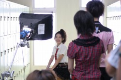 次のシーンでの撮影準備が整うまでは、待ち時間となる。通常ならここは休憩なのだが、大忙しの彼女たちには、別の仕事が入っていた。雑誌『Up to boy』の取材&撮影である。場所を移動し、まずスチールの撮影。そして楽屋でインタヴューが行なわれた。こちらの模様は、現在発売中の同雑誌に掲載されているので、チェックしてみてほしい。
