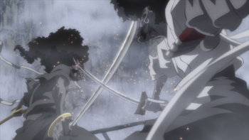 ロケット弾を放つ「六太郎」、アフロの剣術データをメモリしたロボット「アフロドロイド」、アフロの昔なじみらしいかぶりものの「クマ侍」等等、無無坊主が次々と送り込む剣客の数々に、果敢に挑むアフロサムライ。彼ははたして、父親の復讐を果たすことが出来るのだろうか?