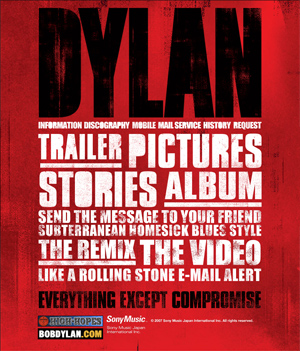 現在DYLAN ICONキャンペーンの一環として<VISIONS OF DYLAN>と題されたイベントが実施されている。こちらは、ロン・ウッド(The Rolling Stones)/パティ・スミス/ブライアン・アダムス/メアリー・マッカートニー(ポール・マッカートニーの長女:写真家)/スカーレット・ペイジ(ジミー・ペイジの娘:写真家)/リリー・コール(スーパーモデル)他といった、全世界の音楽・映画・ファッション・アート業界のディランを愛する著名人・セレブリティ達が参加している催しもの。それぞれ自身のボブ・ディランへのパーソナルな想いやディランの音楽からインスパイアされたイメージなどを写真撮影し、その作品を写真展とWEBに提供してもらうというものだ。