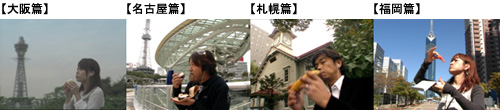 CMの舞台となったのは、大阪は通天閣、名古屋はテレビ搭、札幌は時計台、福岡は福岡タワーと、各地の観光スポット。出演タレントは、大阪―読売テレビ『なるトモ!』で陣内智則と司会を務める“なるみ”、札幌―北海道テレビ『イチオシ!』司会の“ヒロ福地”、名古屋―人気音楽番組『BOMBER-E』司会の“黒岩唯一”、福岡―九州朝日放送『ドォーモ』に出演中の“斉藤ふみ”と岡本啓演じる人気キャラクター“岡本先生”と、それぞれローカルで絶大な影響力を持つタレントを起用している。