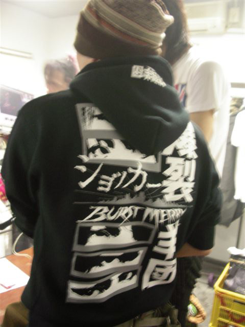 ▲ガラの公約どおり、メリーとショッカーのコラボ・パーカを着用していたマネージャーのO氏。