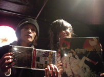 | ▲12月28日、ガラは東京に到着するやいなや下北沢・SHELTERに直行してBALZACのライヴに参戦。写真は終演直後のHIROSUKE(BALZAC:vo)とガラ。お互いの最新アイテム交換を果たし、2人ともご満悦。 |