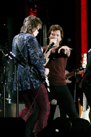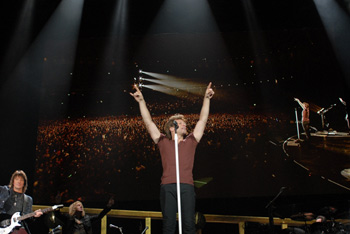 開演時間から間もなく会場は暗転。ヴィジョンにはメンバーが新作について答えるインタビュー映像が流れ、それが切り替わるとステージに向かうメンバーの姿が! ステージに上がった本物のボン・ジョヴィの姿に会場は一気にヒートアップ。髪をショートにし、ますますオトナのオトコの色気が増したジョン、満面の笑顔でファンの声援に応えるリッチー、若いころのハデさは影を潜め、明らかに良い年の取り方をしたロッカーとしての風格に満ち溢れていた。
