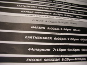当日、ステージに登場したのはMARINO、EARTHSHAKER、そして44MAGNUM(出演順)。「単なる同窓会では終わらせたくない」と口で言うだけなら簡単なことだが、どのバンドも本当にノスタルジックな心地好さだけにとどまることのない、まさに熱のこもったライヴ・パフォーマンスを繰り広げてくれた。まずは各バンドのセット・リストをご紹介しておこう。