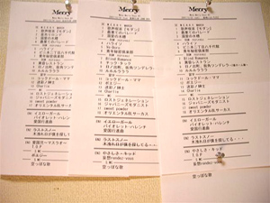 | ▲風邪のバンド内流行が最高潮にあった3日間の演奏内容。 よーく見ると、中央の長野でのセットリストでは、アンコールのうち4曲(イエロー/ラスト/木洩れ日/やさしさ)が線で消されている。メリーの皆さん、このリヴェンジをいつかかならず! |