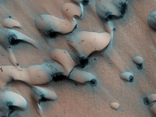 どうやらこれは、火星の北極近くの砂漠の様子。火星では、冬の間、極地を水と二酸化炭素の氷が覆う。そんな氷も春になると溶け始める。火星の大気は希薄なので、氷は溶けると液体ではなく直接気体(ガス)になり、時としてそれは、ジェット爆発となって薄い氷を突き破る。黒い穴みたいなところは、まさにそんなプロセスが発生した跡らしい。ちなみに、陶器のようなツルツルな形は、極地を吹く強い風が作り上げたもののようだ(写真の尺度がよくわからないのであくまで推測だが、この写真は、火星上空から撮影されているのではないだろうか)。