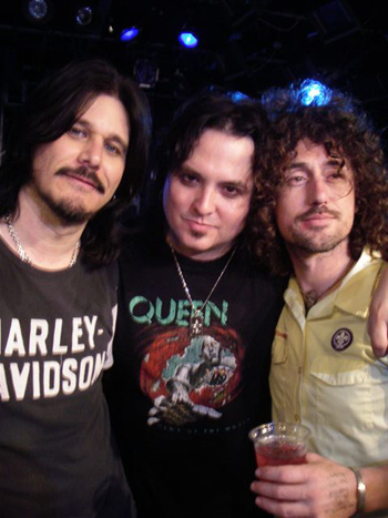 | ▲昨夜の公演終了後のギルビー(左端)と、今回、彼の脇を固めているメンバーたち。中央はファスター・プッシーキャットへの参加歴もあるチャド・スチュワート(ds)、そして右はバーニング・トゥリーのメンバーとしても知られるマディことマーク・ダットン(b)。終演後にはサイン会もあるし、ギルビーは「明日はまったく違うセットリストを用意してるからな!」と宣言。何が飛び出すかお楽しみに。 |