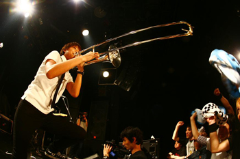 ライヴは、3ヶ月間のオレスカとのお別れを惜しむ感傷なんぞなんのその。いつもの通り最初から最後まで全力疾走だ。ステージ上は白黒のチェッカーを入れ込んだ衣装に身を包み、吹くわ、跳ねるわ、叫ぶわの大騒ぎ。客席も身体を揺するだけの大人しい人から、タオルを振り回したり、サークルで押し合いへしあいをしたりの大騒ぎの人まで多種多彩。それぞれ自分の楽しみ方でオレスカを身体いっぱいに受け止める。