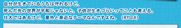 RYOJI:「子供たちの未来へ」 もKOHNOと組んでやったんだけど、最近は細かいテーマを打ち合わせなくても、メンバー同士で察知がつくんですね。それぞれのメンバ-に子供ができて、広い視野でものを考えるようになったり。自分が生きているうちは守れるけど、死んだ先の世界が平和じゃないと、子供が生きづらいってことも考える。壮大ではあるけど、意外と身近なテーマなんですよね。 親が考える普通のことなんですよね。自然とそういう風になったんですよ。まぁ、いまだに 「カーニバル」 みたいな感じでいたいですけどね。