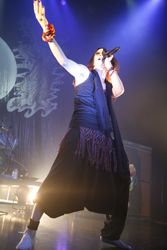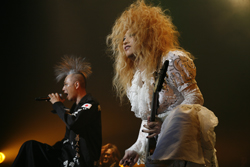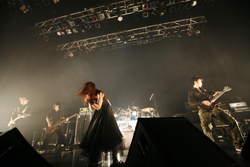 例年にも増して個性的なメンツが顔を揃えた今回。オープニングを飾ったのは、アメリカや北欧、アジア圏でのライヴも積極的に展開しているHEAD PHONES PRESIDENT。紅一点ヴォーカルのANZAがフワリとドレスを広げ、祈るように両腕を高く掲げてから一呼吸の間をおき、その沈黙から一転。ラウドな轟音の渦の中で、狂気と幻想の狭間を行き来するようなパフォーマンスでオーディエンスを圧倒した。