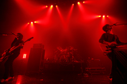 続いて登場したのは、凛として時雨。音楽関係者の間でも「いま一番気になるバンド」や「最近観た一番良かったライヴ」の筆頭に挙げられる彼らの登場に、場内も沸く。ヴォーカル&ギター+ヴォーカル&ベース+ドラムという、ロック・バンドにおける最小限の編成から繰り出される音は、直感的でいて実に整理された無駄のないアンサンブルを奏で、3ピース・バンドとしての見事な完成形であると同時に、さらなる可能性も強烈に感じさせた。曲が進むに連れて次第に大きくなっていったモッシュの波が、そのことを証明していたと思う。
