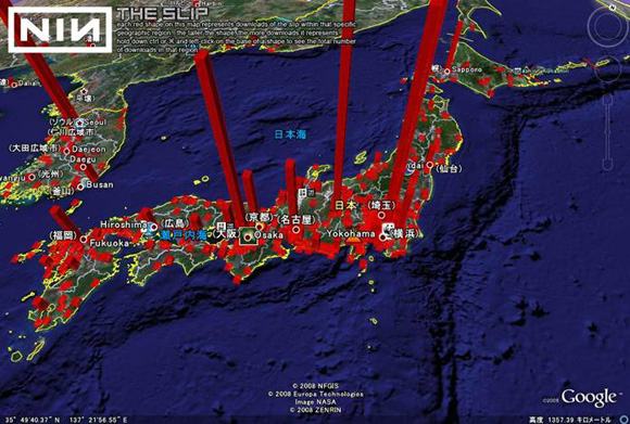 Google Earthがインストールされた環境であれば、その他全世界でのダウンロード状況も見ることができる、革新的なもの。非常に興味深いダウンロード結果が見てとれるが、トレント・レズナーが追伸として「フィジーからDLしてくれたファンの君!遊びにいったら泊めてくれる?」というジョークも飛ばしつつ、意外な地域でもしっかりDLされているよことがよく分かる。