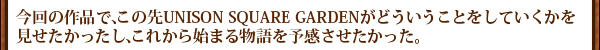 斎藤:今までに経験したことのない大きなステージもあるんですけど、僕らは結成して4年間、ライヴに活動の重点を置いておいて、ライヴを重ねることで自分達自身や曲を磨いてきたので、お客さんを楽しませる自信はあるんですよ。いつか日本の音楽シーンをUNISON SQUARE GARDENの大きな渦に巻き込んでいけたらな、と思います。