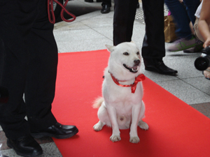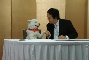 約10分の撮影の後、場所を同社大会議室に移して、代表取締役社長 加藤裕一氏との契約調印式に挑んだカイくん。会場に現れるや浴びせられるフラッシュの雨にも一向に動じる気配もなく、落ち着いた面持ちで椅子に腰掛ける。そして、おもむろに朱肉を掌にズリズリとこすり付け、涼しい顔で契約書に“肉球”でサイン! その後加藤氏のサインも加わり、ここにビクターエンタテインメントとのDVD出演契約が締結されたのだった。