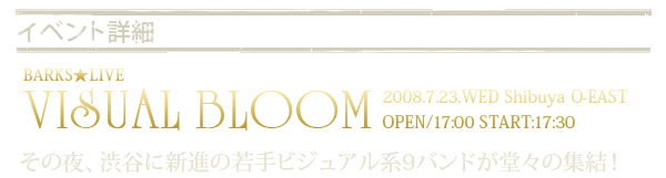 ビジュアル系バンドの祭典<BARKS★LIVE「VISUAL BLOOM」>が、7月23日Shibuya O-EASTで開催される。これは、いまもっとも注目を集めているインディーズレーベルが全国から集結。東京のKranze、大阪のUNDER CODE PRODUCTION、静岡のシークエンス レコード、京都のCROW MUSICなどのレーベルから選りすぐった最新のバンドが出演するイベントだ。そして、このイベントの開催を記念して発売されるコンピレーションCD BARKS「VISUAL BLOOM」は、このイベント出演アーティストだけでなく、Kαin、-oz-、Art Cube、n’DooLといったアーティストの楽曲も収録される。