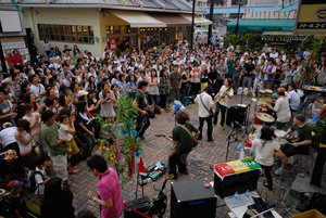 始まって以来かと思われる約500人のお客さんがひしめき待つ中、夕刻ついに登場したFUNKIST。挨拶もそこそこ、いきなりの「沖縄」に、集まったお客さんも一瞬にしてアガるアガる! その一体感たるや、間違いなく染谷西郷の“今日王子を地球上で一番アツい場所に!”というMCそのもの。