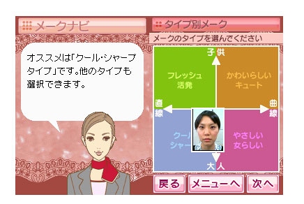 具体的には、ニンテンドーDS専用顔認識カートリッジ「DSスキャン」で取り込んだ使用者の顔を、資生堂の理論に基づいた算出方法でいくつかのパターンに分類。顔立ちに合うメークを提案するだけでなく、メーク手順の解説も行なう。さらに、取り込んだ顔の画像に新しいメークを試すことができるほか、お肌やメークの知識を確認することも可能となっている。
