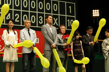 舞台に設置された野球のスタジアムセットには、神山征二郎監督をはじめ、主演の渡辺大、石坂浩二、柄本明、富司純子、柄本佑、宮川一朗太、三波豊和、原田佳奈、和田光司、脇崎智史、片山享、中村俊太と豪華俳優陣が一堂に会した。